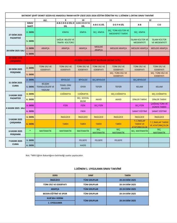 2025 - 2026 Eğitim Öğretim Yılı 1. Dönem 1. Yazılı Sınav Takvimleri