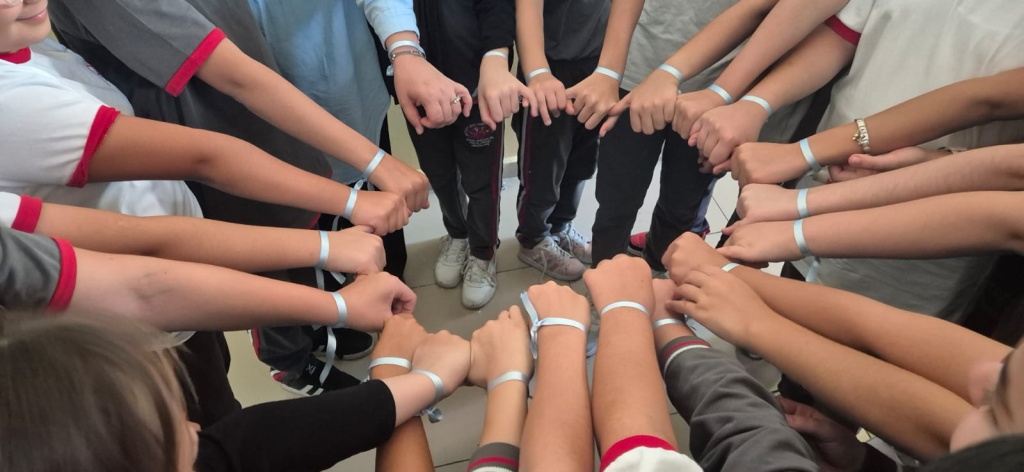Okulumuzda, Filistin halkının onurlu direnişine dikkat çekmek ve barışa destek olmak amacıyla öğrencilerimize mavi bileklikler dağıtıldı ve hep birlikte taktık.